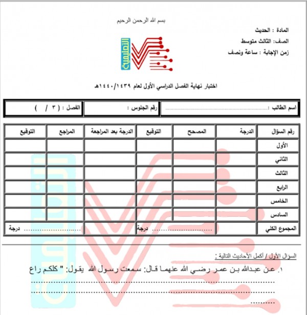 نماذج اختبارات حديث نهائي ثالث متوسط الفصل الاول 1440 البسيط دوت كوم